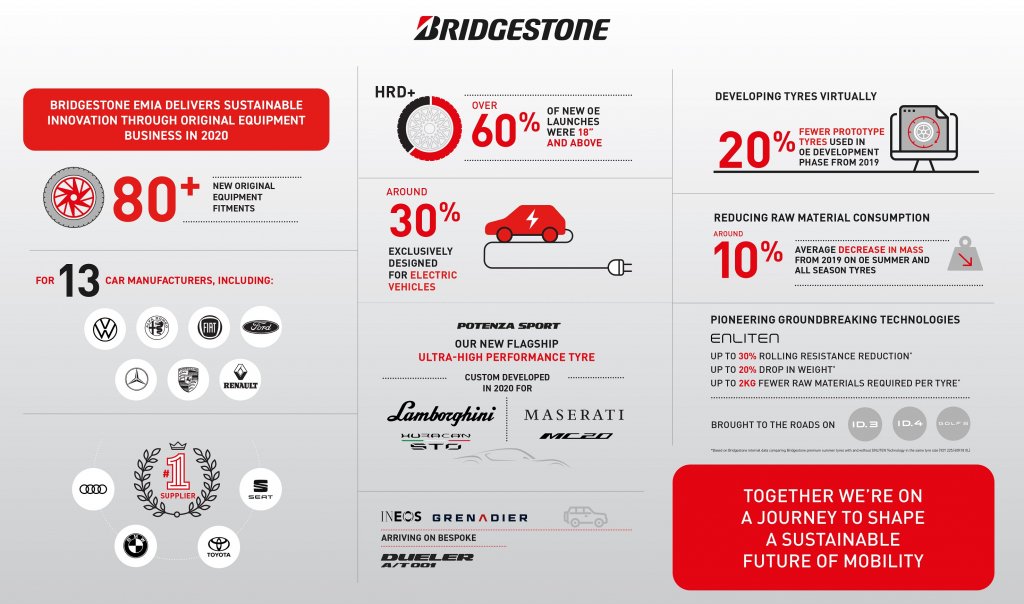 Bridgestone, jako wiodący dostawca zaawansowanych rozwiązań w zakresie zrównoważonej mobilności oraz partner światowych producentów samochodów nieprzerwanie rozwijał działalność w zakresie OE (Original Equipment), dzięki specjalistycznej wiedzy i innowacjom. W 2020 r. dział OE Bridgestone EMIA dostarczył ponad 80 różnych rozmiarów i modeli opon 13 producentom samochodów, takim jak Mercedes, BMW i Audi, do ponad 30 różnych modeli pojazdów.