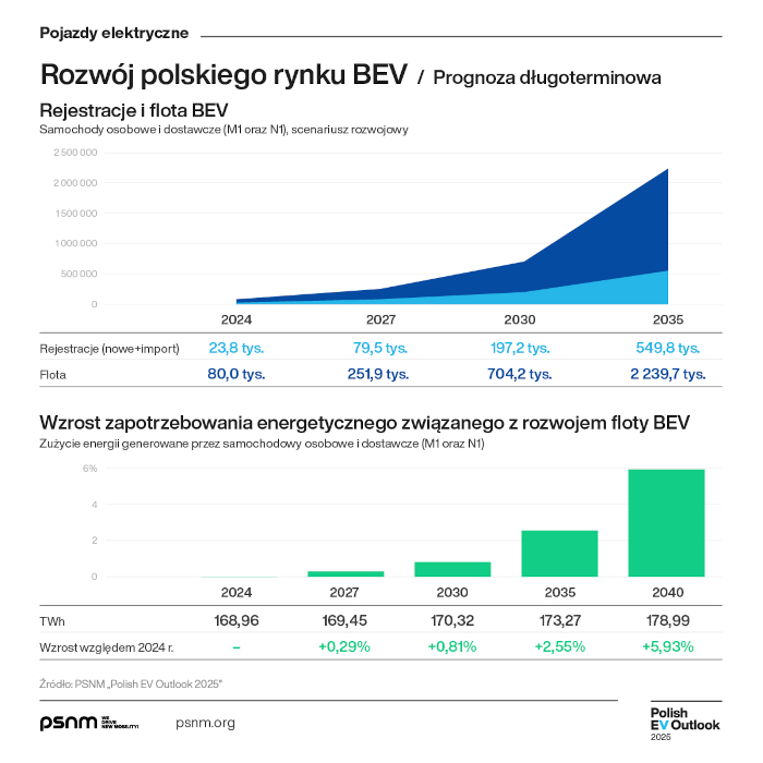 - Odpowiedzi na to pytanie udzielamy w najnowszym wydaniu Polish EV Outlook w dwóch wariantowych scenariuszach. Bardziej optymistyczna prognoza, przewidująca m.in. szeroką optymalizację prawa, zakłada, że do 2030 r. liczba rejestracji osobowych i dostawczych BEV może wzrosnąć do ok. 197 tys., a po polskich drogach będzie jeździć ponad 700 tys. takich pojazdów. To niemal 7 razy więcej niż obecnie. Udział BEV na rynku pojazdów osobowych zbliży się do średniej odnotowanej obecnie w UE już za mniej niż 4 lata. W 2029 r. pod względem udziału zbliżymy się do wyników obserwowanych dziś w Niemczech lub Francji. Europejskich liderów, w szczególności Danii, nie „dogonimy” jednak aż do 2035 r. - mówi Jan Wiśniewski, dyrektor Centrum Badań i Analiz PSNM.