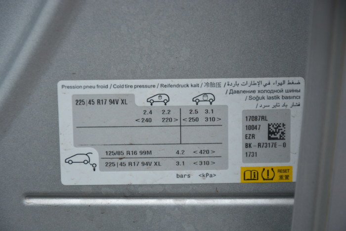 Natomiast w 18-calowych ciśnienie powinno być inne, każda z trzech liczb dla „18” różni się od wartości w „17”. I tak w „18” z przodu zawsze należy utrzymywać 2,3 bara, z tyłu 2,1 przy małym obciążeniu oraz 3,0 przy dużym obciążeniu. Oprócz dojazdówki 125/85 R16 99M (4,2 bara) nalepka podaje zapas pełnowymiarowy, 225/45 R18 92Y XL z ciśnieniem 3,0. Logiczne, to najwyższa wartość dla „18”.