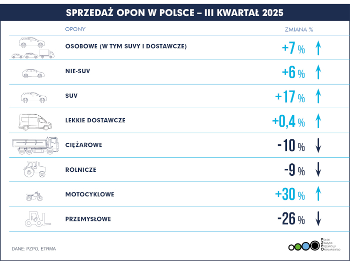 W trzecim kwartale 2025 sprzedaż opon ogółem wzrosła o 7 proc., opon do samochodów osobowych o 6 proc., do SUV-ów aż o 17 proc., dostawczych o 0,4 proc., a motocyklowych aż o 30 proc. Opony do maszyn rolniczych notowały sezonowy spadek o 9 proc., zmalała też sprzedaż w segmencie opon przemysłowych (o 26 proc.) i ciężarowych (o 10 proc.).
