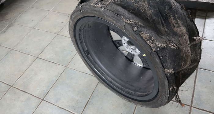 W przypadku gdyby pojazd poruszał się na standardowych oponach o tak niskim profilu - 315/35 R22 (prawy tył) oraz 275/40 R22 (prawy przód) - doszłoby z pewnością do widocznych uszkodzeń ściany bocznej i stalowego opasania.
