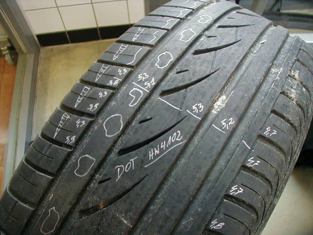 Nierównomierne zużycie bieżnika (fot. 2), np. ząbkowanie, zużycie środkowe, ścieranie barków opony - wynikające ze złej geometrii zawieszenia, stylu jazdy, błędnego ciśnienia powietrza w kole.