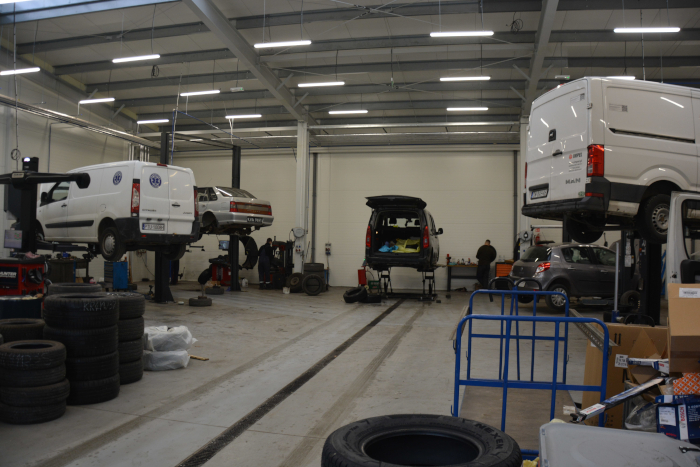 Zawsze podajemy, iloma stanowiskami dysponuje odwiedzany przez nas serwis. W tym przypadku liczenie okazało się proste. Gdy wszedłem do hali zrobić zdjęcia, załoga obsługiwała jednocześnie siedem samochodów, wszystkie stanowiska były zajęte. Pięć podnośników słupowych, jeden płytowy i jeden do ustawiania zbieżności. Na przestronną halę prowadzą trzy bramy. R. Lupa podkreśla, że wiele czasu zajęło rozplanowanie siedmiu stanowisk. Niektóre busy są bardzo długie, więc trzeba było tak wszystko przemyśleć, aby również takie auta mogły bez problemu wjechać i wyjechać. Tuż obok na ukończeniu jest 22-metrowa hala do obsługi pojazdów ciężarowych. I jeszcze jedna istotna kwestia - wyposażenie serwisu w sprzęt wysokiej jakości marek: Hunter, Hofmann, Haweka, Corghi.