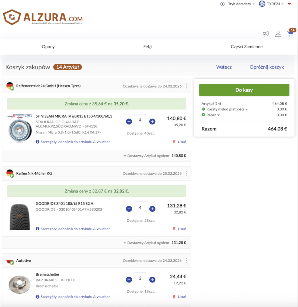 Jak podaje firma, nowa funkcja umożliwia dealerom opon i warsztatom dodawanie produktów od różnych dostawców do jednego koszyka. Zamówienia można następnie składać w całości lub częściowo - oddzielnie dla każdego dostawcy.