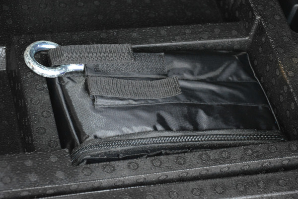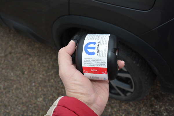 Zestaw naprawczy nadaje się do reperacji większości otworów powstałych po przebiciu w obszarze bieżnika, nie większych niż 4 mm. Akurat te 4 mm podaje mała instrukcja pt. „Broszura z podstawowymi informacjami”. Zestaw w etui na zamek błyskawiczny leży pod podłogą bagażnika, odchylaną, podzieloną na dwie części. Trzeba podłogę przytrzymać, albo wyjąć, usunąwszy dwie spinki. Pojemność butelki z środkiem uszczelniającym wynosi 300 ml.