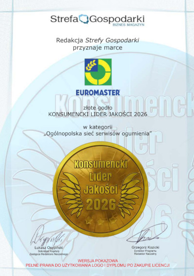 Marka Euromaster zajęła I miejsce w XV edycji programu Konsumencki Lider Jakości 2026 w kategorii „Ogólnopolska sieć serwisów ogumienia”. Sieć otrzymała Złote Godło Konsumenckiego Lidera Jakości, przyznawane na podstawie ankiet konsumenckich.
