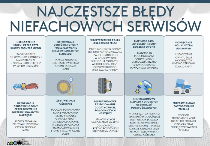 Gdy już wybierzemy opony, to kolej na serwis - który nie uszkodzi ani opon, ani felg podczas montażu czy przechowywania. A to nie jest takie oczywiste. Cześć serwisów wymienia opony bez przestrzegania procedur technicznych, kierując się tylko pośpiechem. Opony są montowane na siłę, gdzie zbyt mocno rozciągana jest stopka opony czy stosowane jest zbyt duże ciśnienie przy przepompowywaniu - byle tylko szybciej zakończyć obsługę klienta. Profesjonalny serwis oponiarski to taki, który nie wymienia opon w sportowym tempie - tylko sprawnie, lecz z wyczuciem. Ma do tego wyszkolonych pracowników i zadbane maszyny z odpowiednim wyposażeniem umożliwiającym bezpieczny montaż opon o rozmiarach 17 cali i więcej. Powtórzmy więc, opony są muszą być obsługiwane sprawnie, lecz z wyczuciem i uważnością. Dokładnie tak trzeba się obchodzić z podzespołem, który jest jedynym punktem styku samochodu z drogą, i jest zrobiony w większości z mieszanki gumowej.