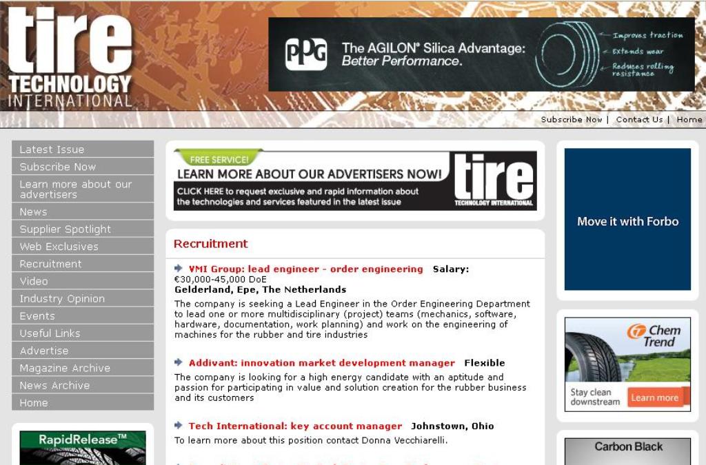 Oprócz aktualnych wiadomości branżowych, portal Tire Technology International zawiera m.in. archiwalne wydania magazynu, zapowiedzi targowe, materiały wideo, blogi oraz dział poświęcony rekrutacji. Firmy z branży oponiarskiej poszukujące nowych pracowników mogą zamieszczać ogłoszenia o pracę bezpośrednio na stronie www.TireTechnologyInternational.com. Oferty są bezpłatnie wyświetlane na stronie przez okres czterech tygodni.