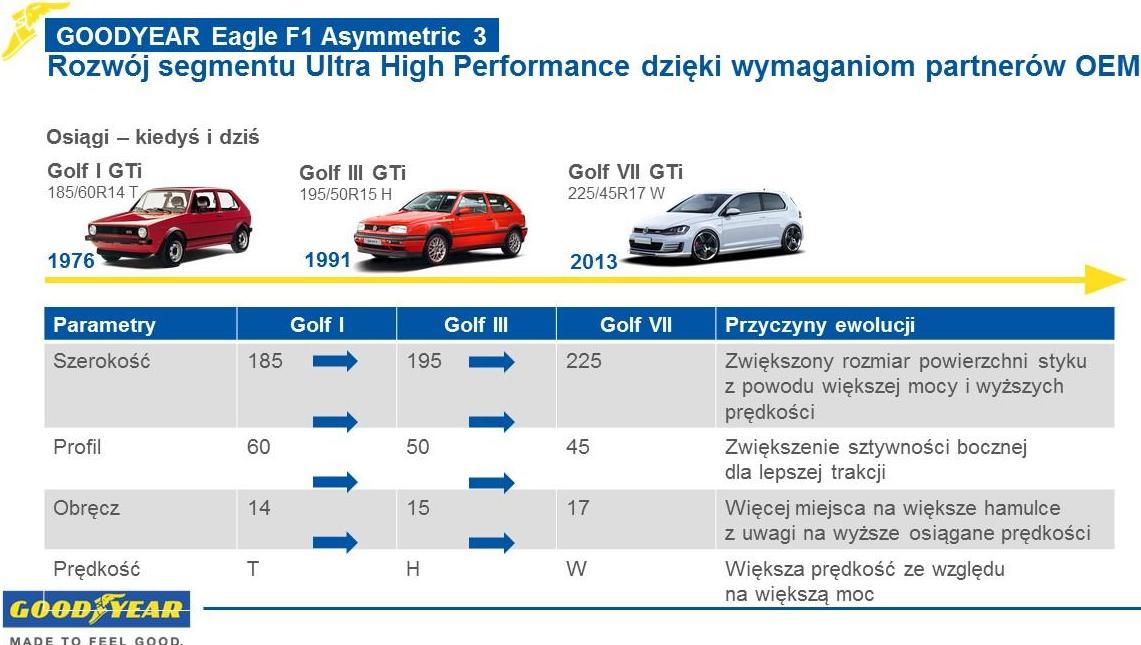 Do niedawna tego rodzaju sytuacja znajdowałaby odzwierciedlenie w równoległej ewolucji poszczególnych segmentów rynku opon. Jednak od 2013 r. można zaobserwować, że popyt na ogumienie UHP (dedykowane wysokim prędkościom, nawet powyżej 240 km/h) nie jest już napędzany przez poszczególne klasy pojazdów (na przykład samochodów luksusowych czy sportowych). Decydującym czynnikiem stał się ogólny rozwój parku samochodowego, za sprawą którego coraz więcej aut ze średniej półki cenowej również wymaga opon UHP. Przykładem tej ewolucji jest Golf GTI, co pokazuje poniższa ilustracja: